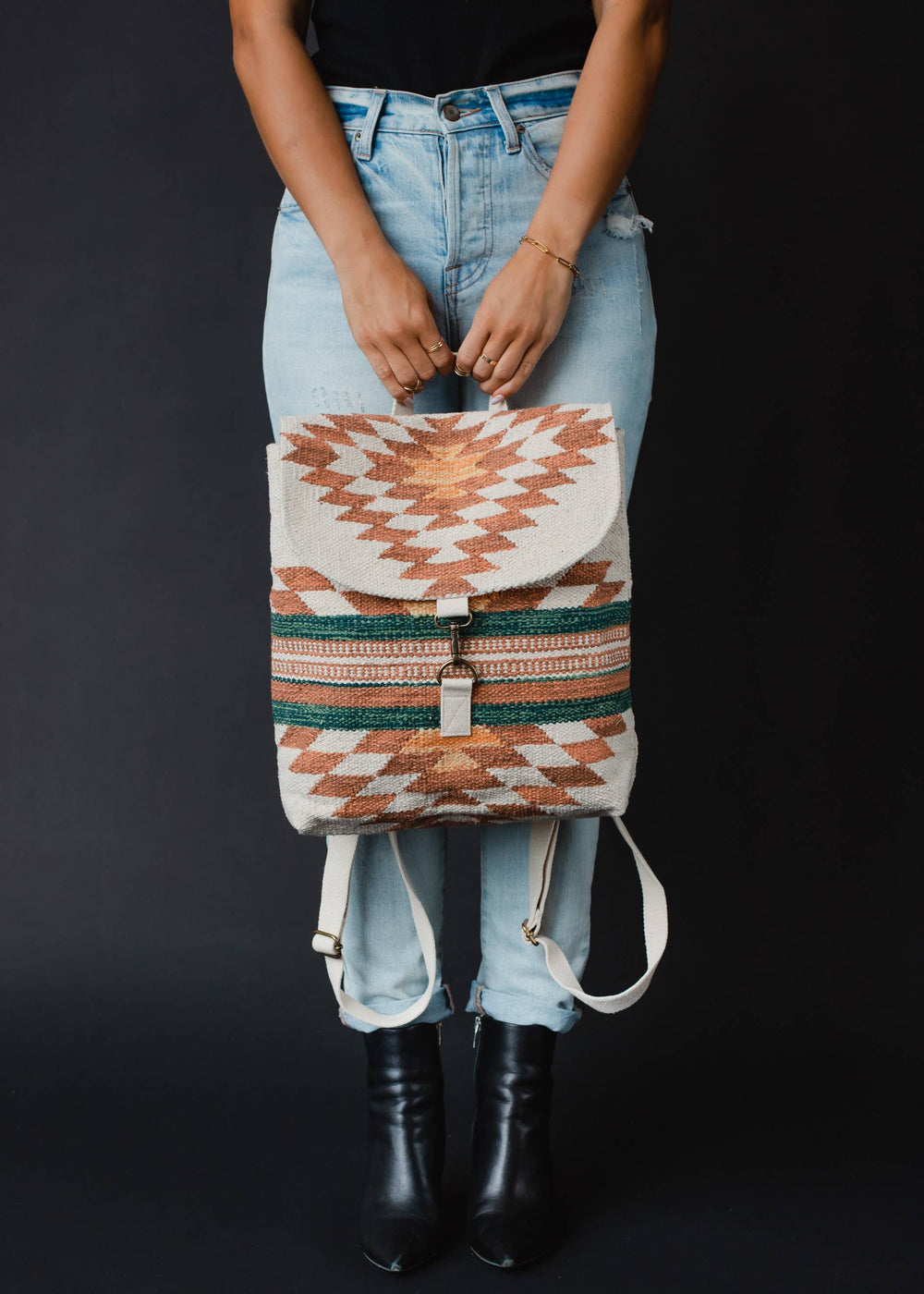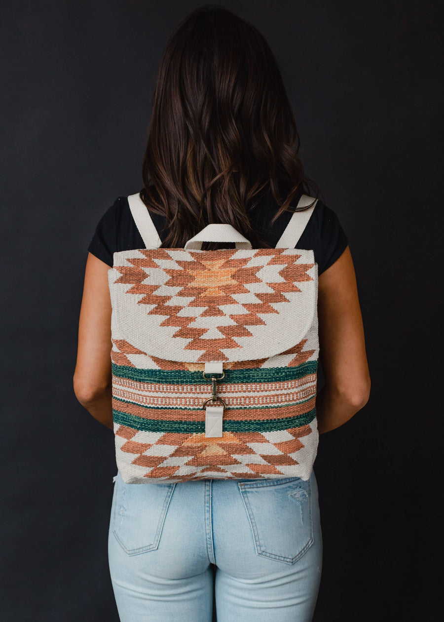 Cream, rust, orange & green Aztec backpack Clasp closure on front Adjustable straps & handle 14" x 11.5" x 4.5" 100% Cotton Min. Qty. 2