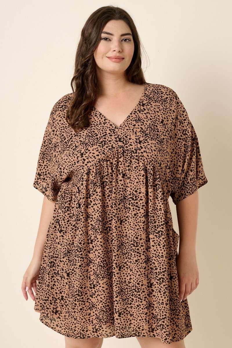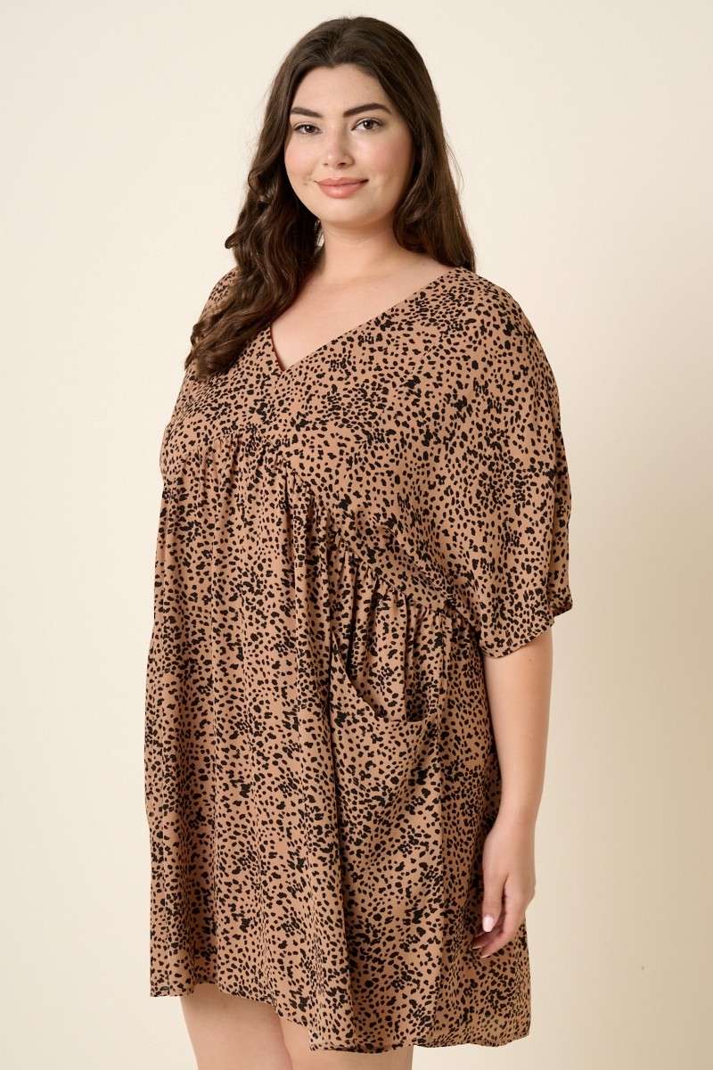 Abstract leopard print on woven fabric – V neckline, dolman sleeve, babydoll body, loose fit, pocket detail, mini dress, body lined.