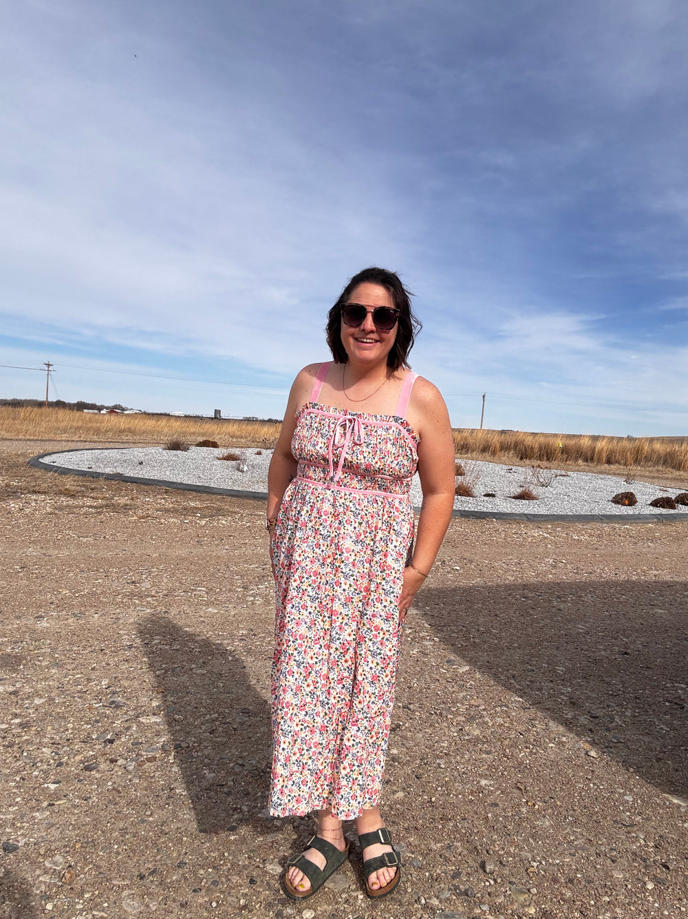 FLORAL MIDI DRESS WITH VELVET TRIM DETAIL - ADJUSTABLE STRAPS - SIDE POCKETS AND LINED SMALL: TOTAL LENGTH - 39" MODEL IS WEARING SIZE SMALL. SELF: 100% COTTON LINING: 100% RAYON *