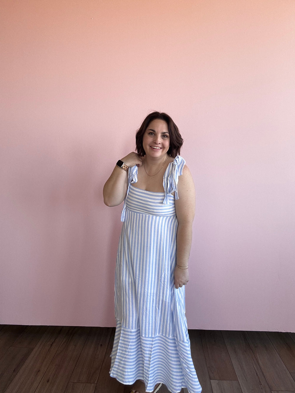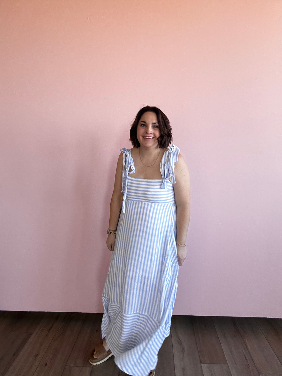 "Set sail into summer with this flattering sky blue dress. With delicate tie shoulder details and a playful striped pattern, this dress will have you feeling like you're on a permanent vacation. Get ready to sail away in style!"