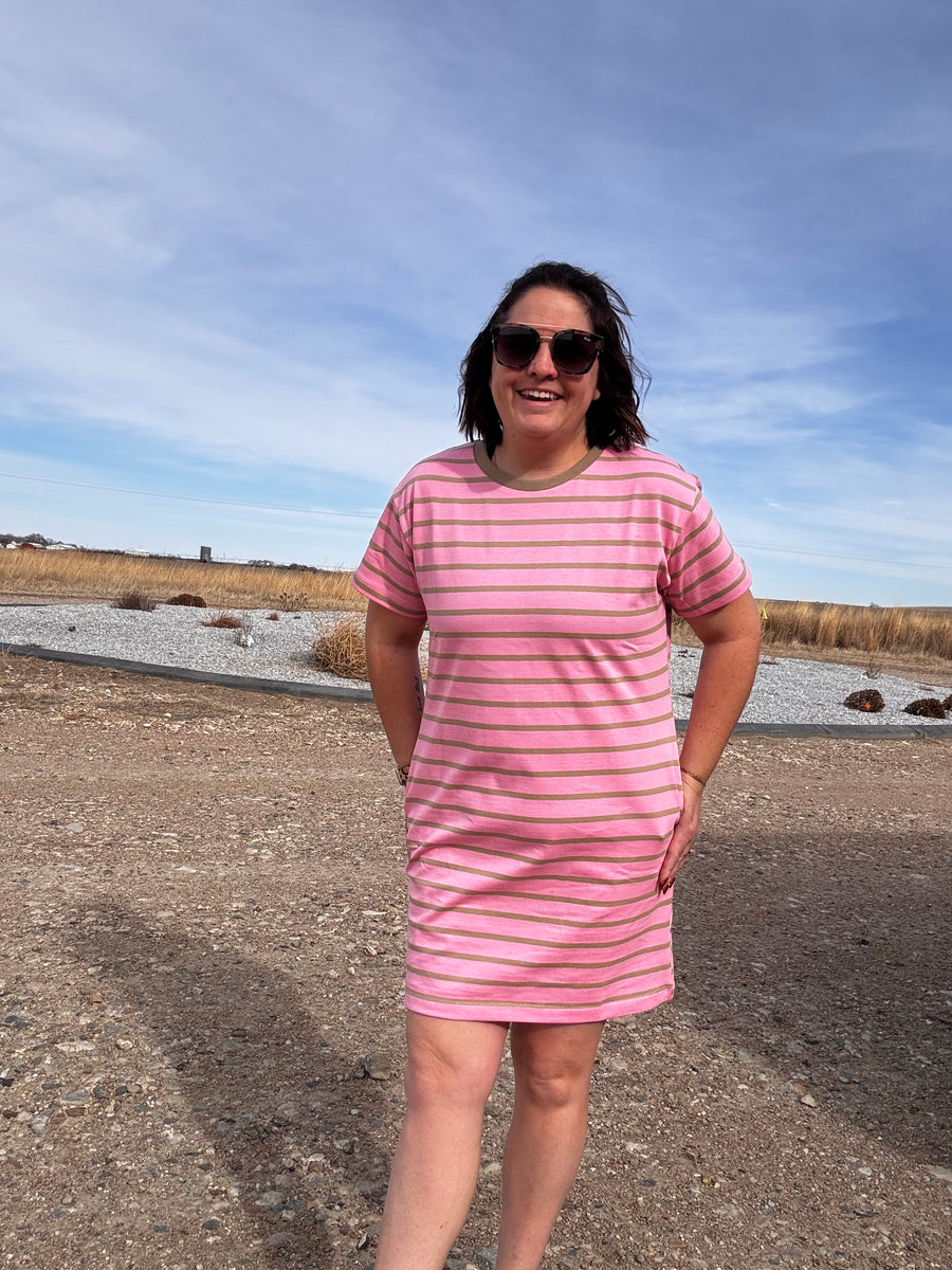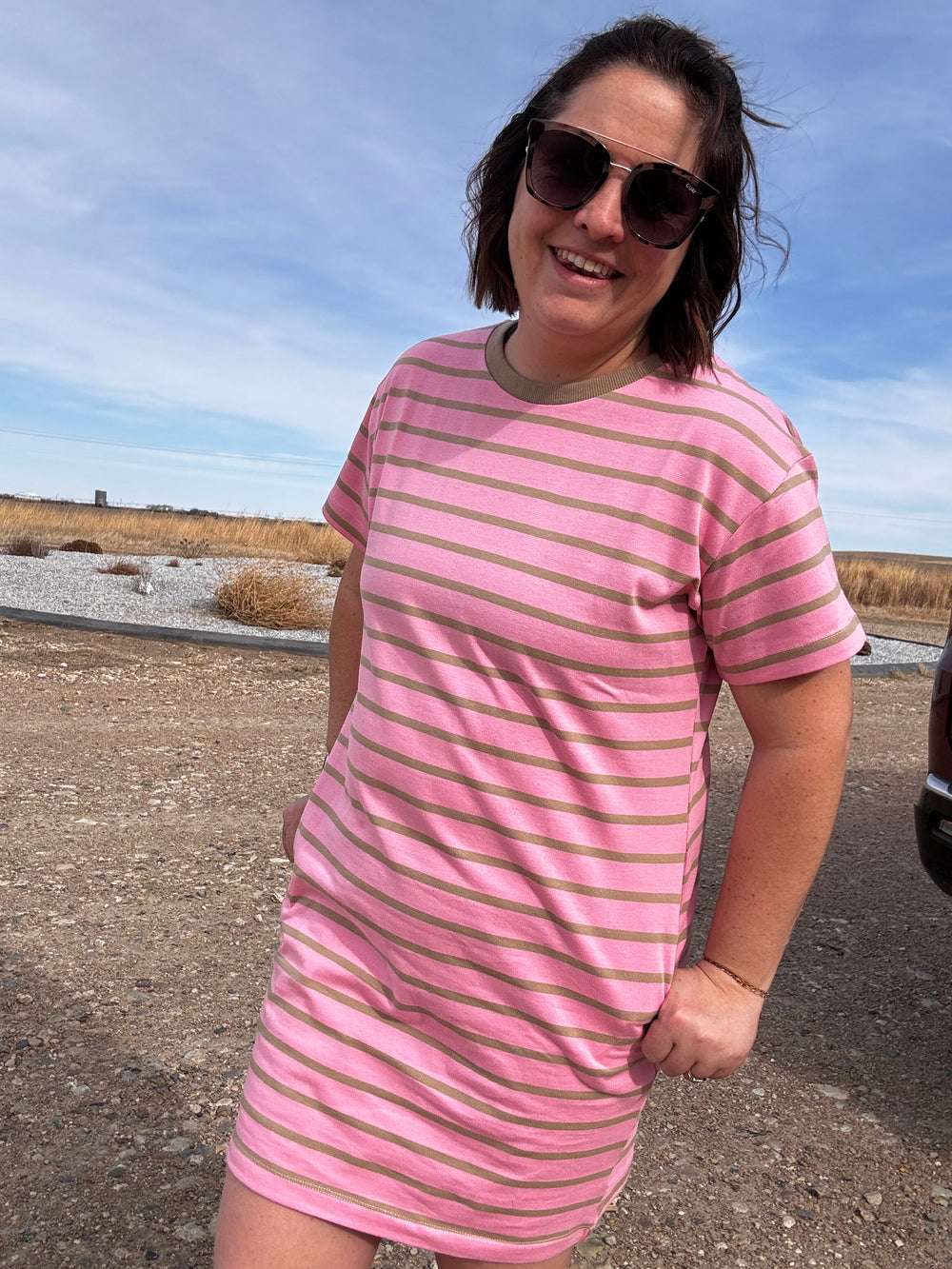 Get ready to add a pop of color to your wardrobe with our Pink Mocha Striped T-Shirt Mini Dress! This essential piece features a playful combination of pink and mocha stripes, making it both fun and versatile. Whether you're dressing it up or down, this dress is sure to brighten up any outfit.