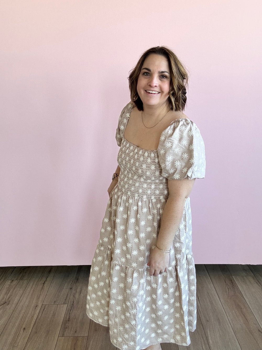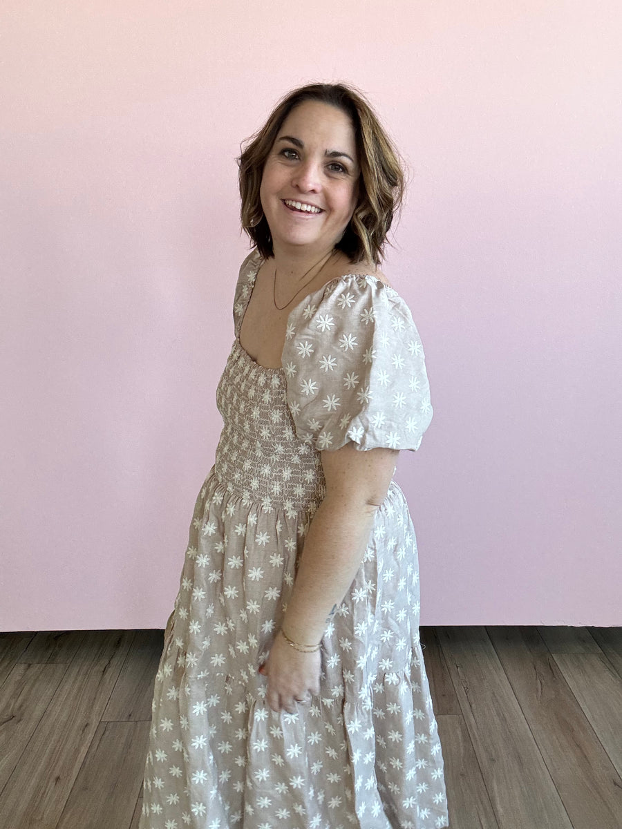 Be the belle of the ball (or the backyard BBQ) in our Sunburst floral dress. The midi length and puff sleeves add some playful volume, while the taupe embroidery brings a touch of elegance. Perfect for any occasion, this dress will have you feeling fresh and fabulous.