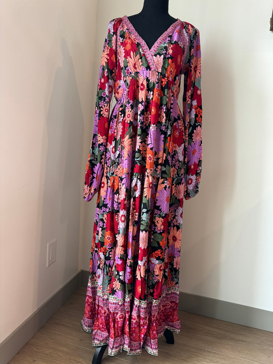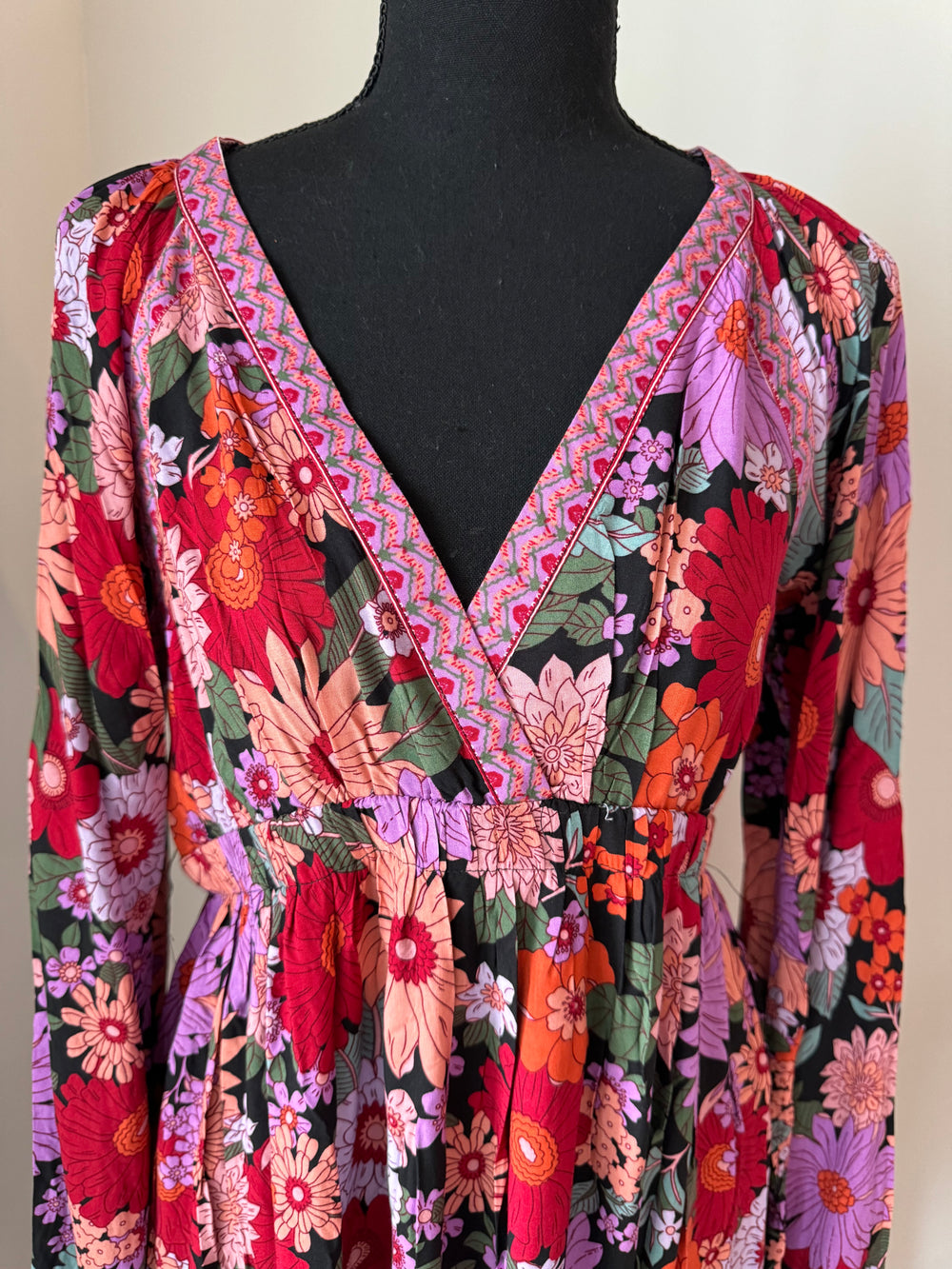 features: slit, lining, lace accent, v neck, long sleeves, floral print