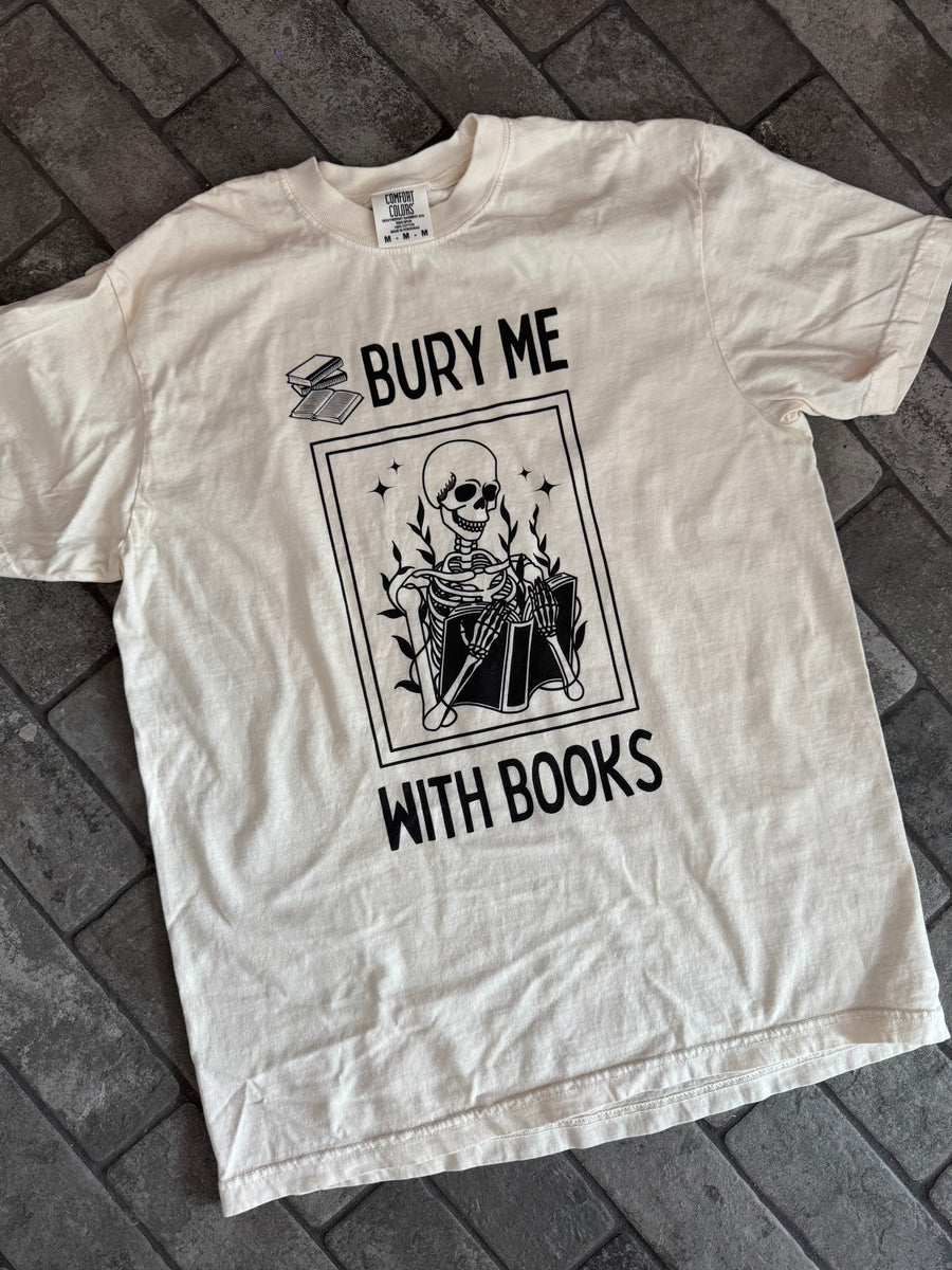 Show off your love for reading (even in the afterlife) with our Bury Me With Books tee. Featuring a skeleton indulging in some literature, this tee is perfect for bookworms and quirky souls alike. (Death may be inevitable, but at least you'll have your favorite books with you!)