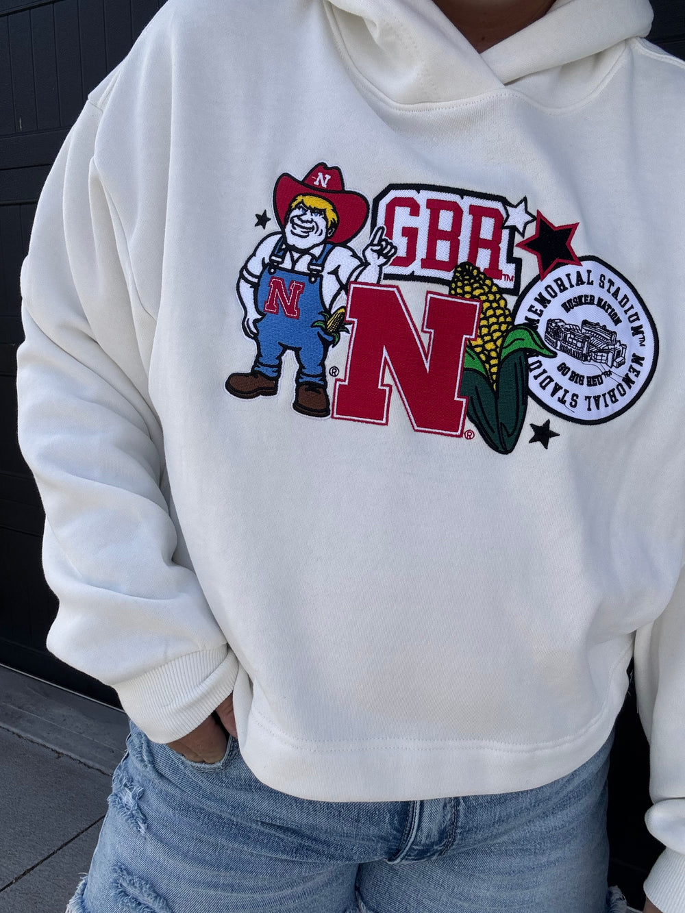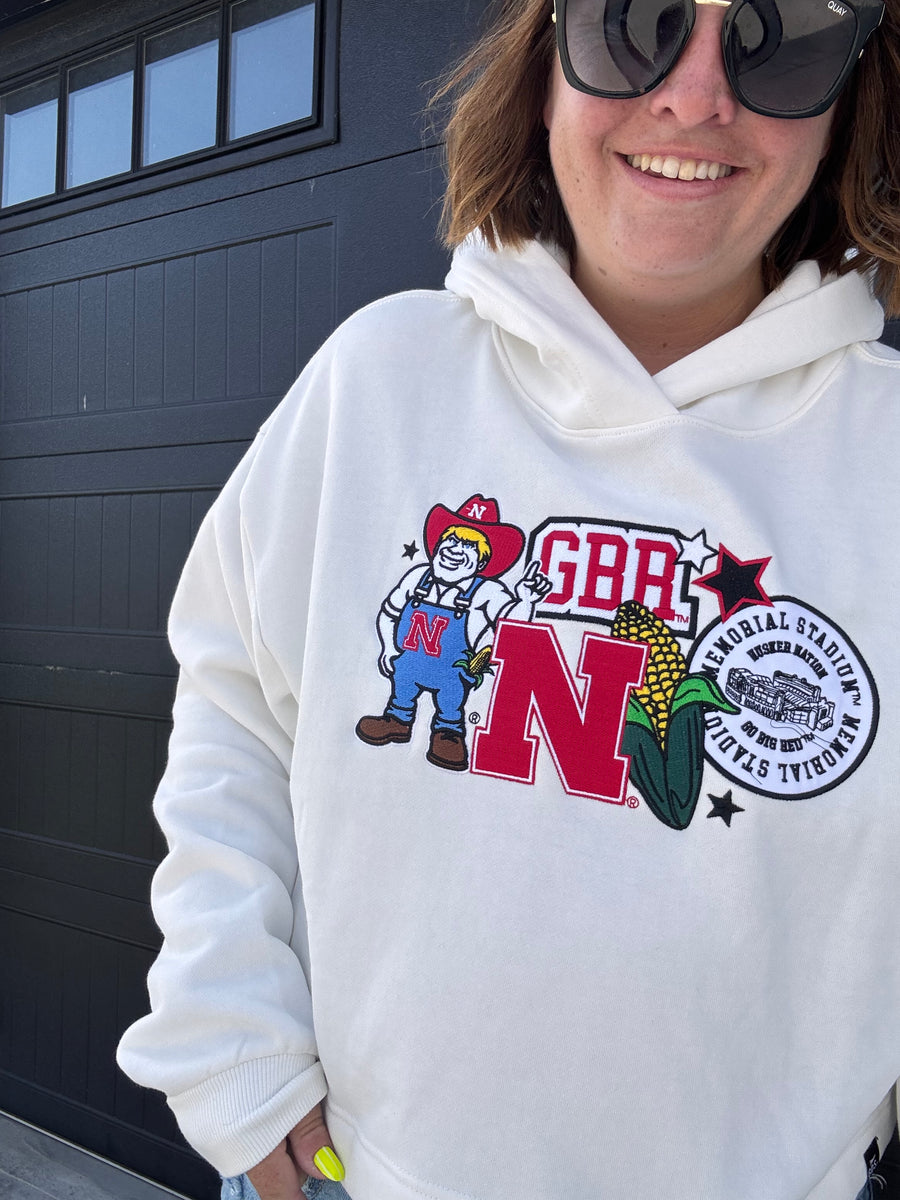 Stay cozy and show your Cornhusker pride with the Nebraska Layer Patch Hoodie. This white hoodie features playful patch details inspired by Memorial Stadium, adding a fun twist to your game day look. Its boxy fit offers a relaxed, comfortable vibe perfect for layering or lounging around. Whether you're cheering in the stands or hanging out with friends, this hoodie brings spirited style and easy comfort together.