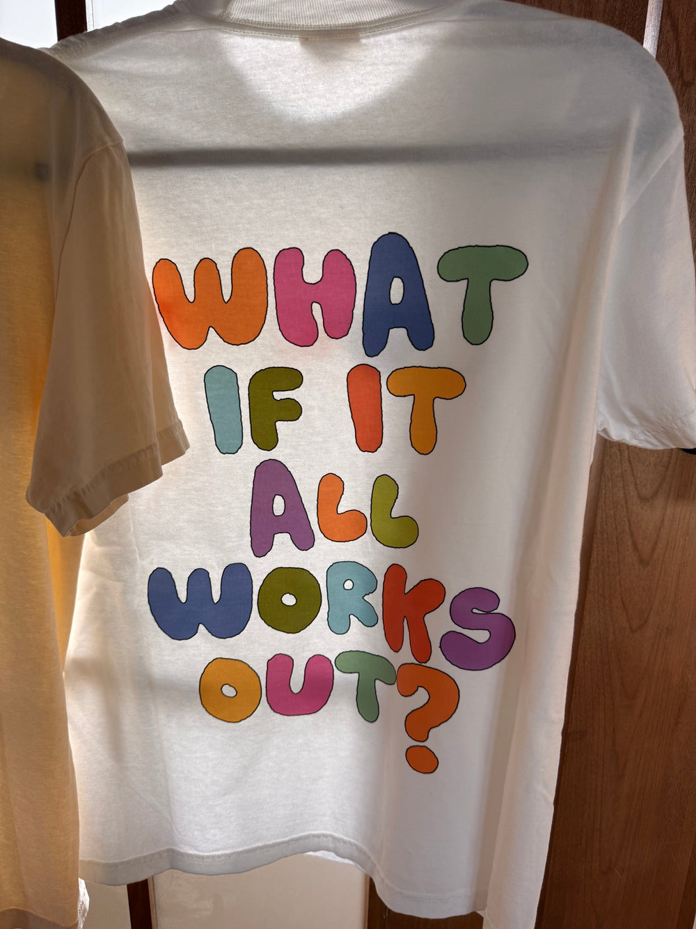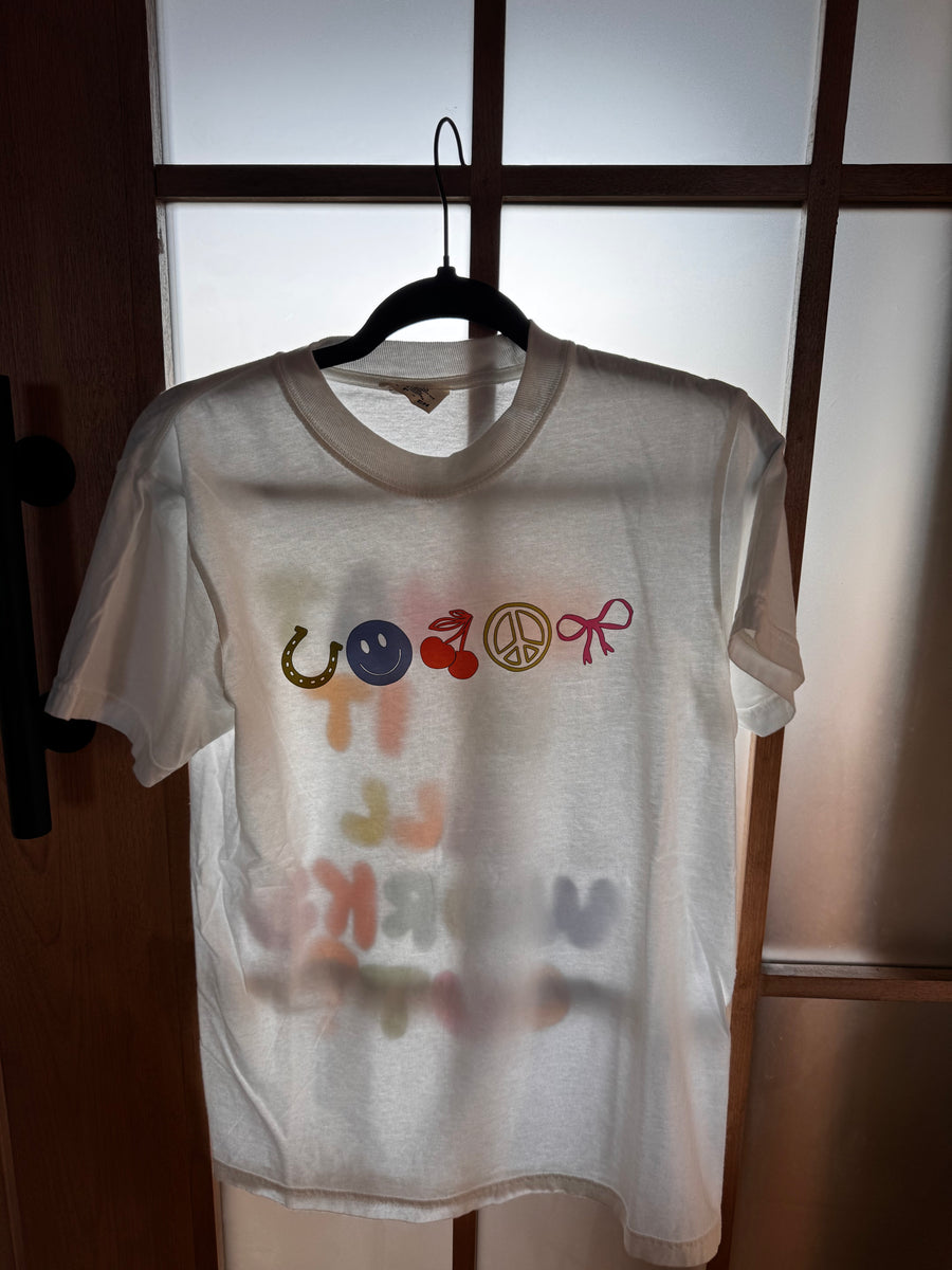 "Get lucky in style with our What if it all works out tee. Featuring a horseshoe, smiley face, bow, and peace sign, this playful tee is sure to bring you good vibes. Who knows, it might just be your lucky shirt! (Includes good luck guarantee!)"
