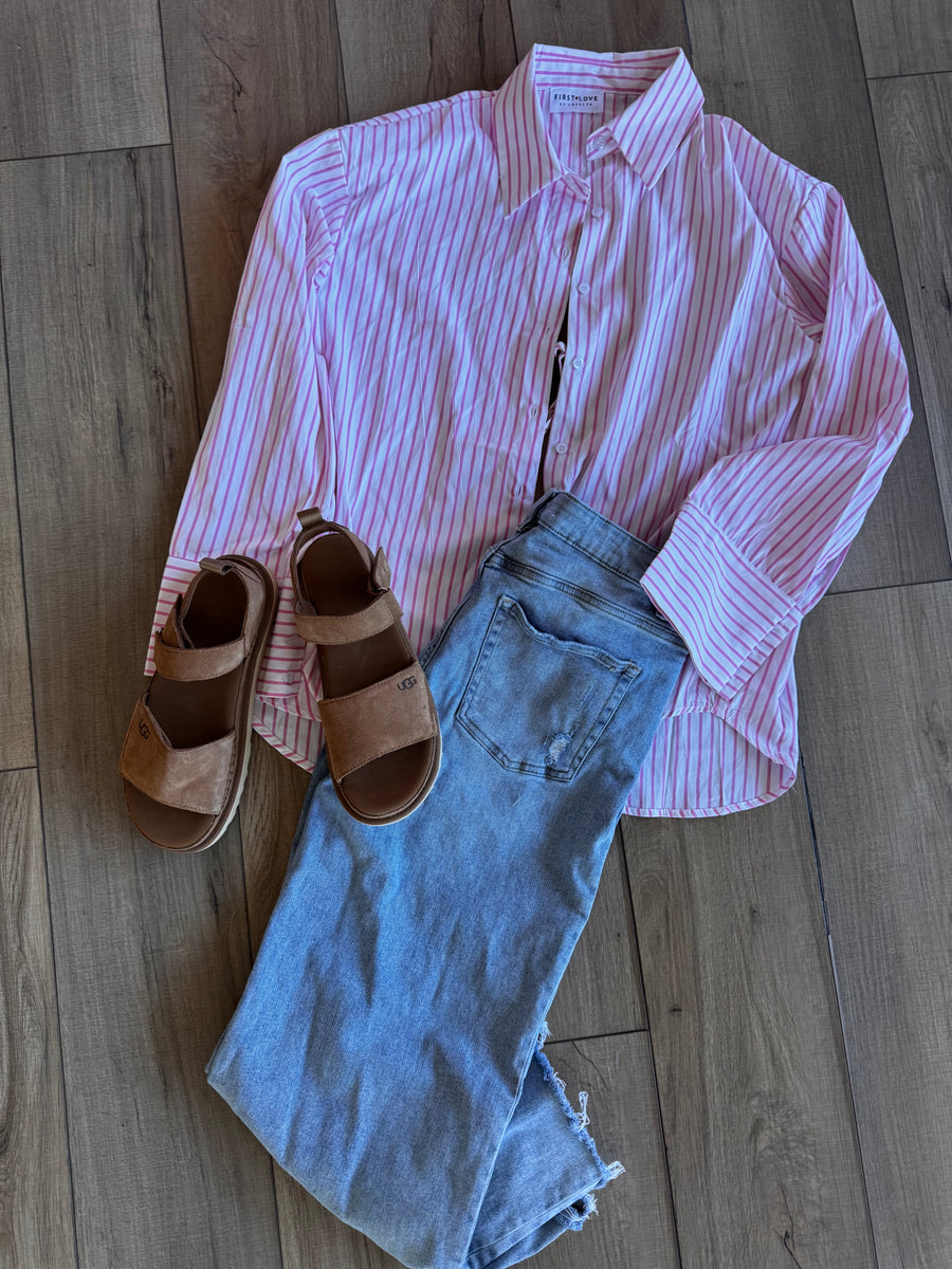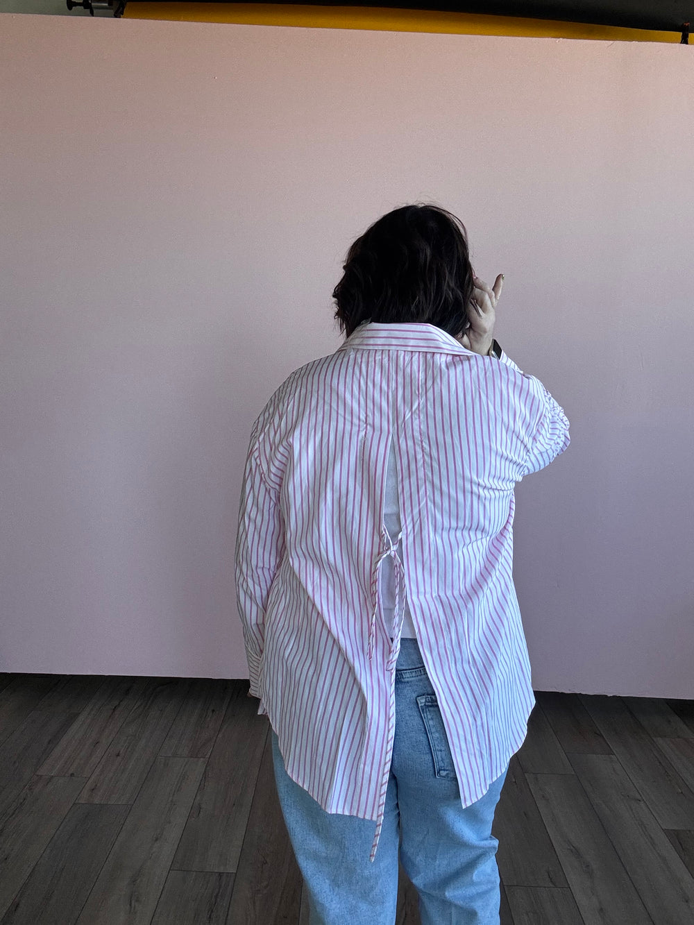Rock this Pink Open Air striped shirt for a playful twist on a classic look. With a bright pink and white striped pattern and an open back design, this collared button down shirt is anything but ordinary. Perfect for adding a touch of fun to any outfit.