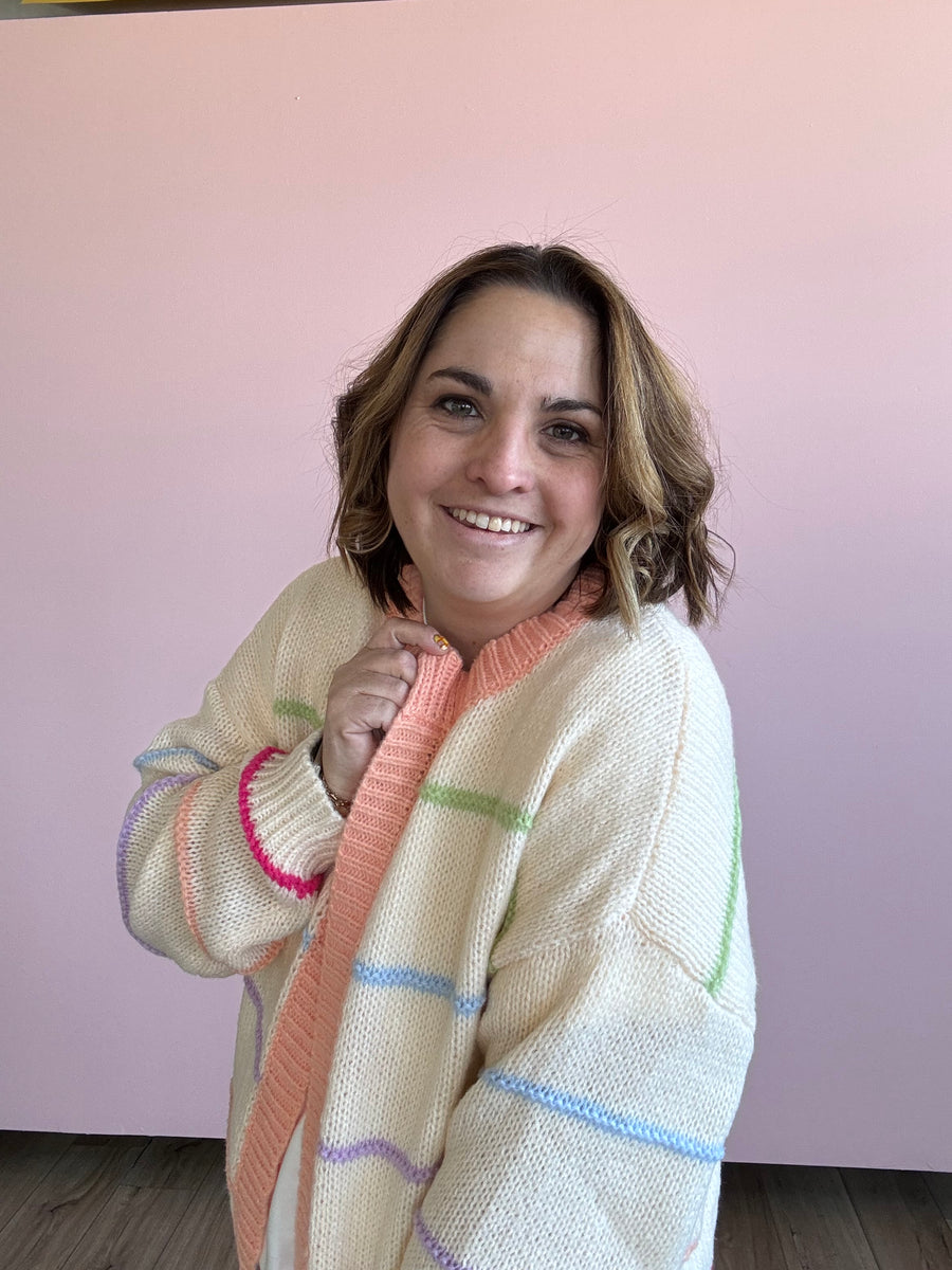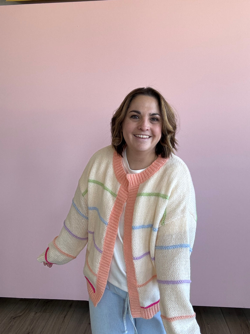 Add a pop of color to your wardrobe with our Rainbow Wrap Open Cardigan. This woven crochet knit cardigan features multicolor stripes and a fun open design. Stay stylish and playful in this quirky piece!