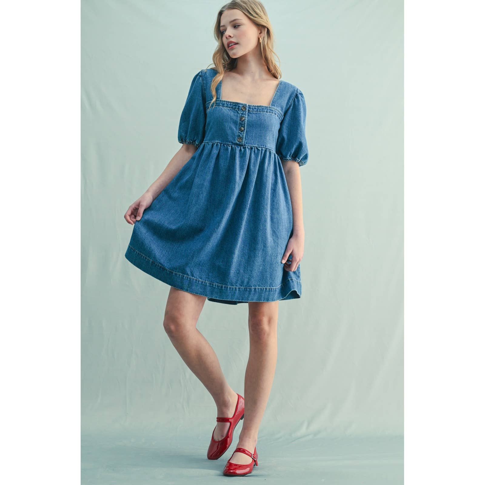 BUBBLE SLEEVE DENIM MINI DRESS - FUNCTIONAL BUTTONS, SMOCKED BACK, SELF BACK TIE, SQAURE NECK, SHORT SLEEVE, EASY, COMFY, FALL, WINTER, CASUAL, EVERYDAY SMALL: TOTAL LENGTH - 33 1/2"