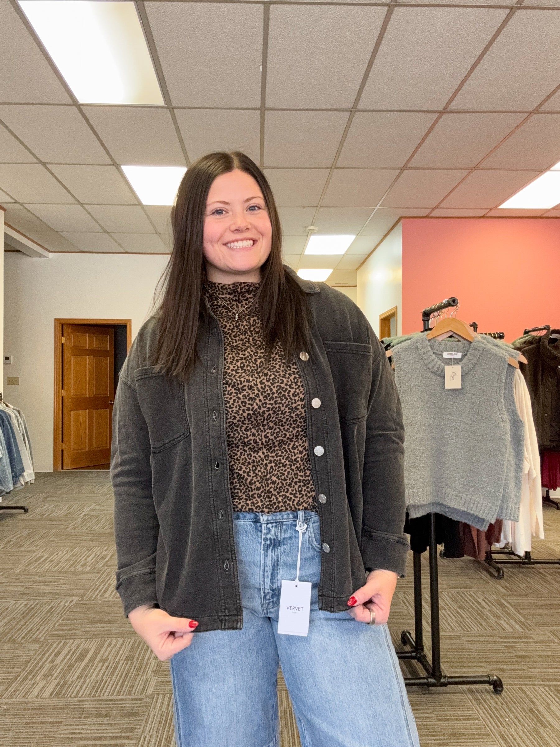 * ULTRA SOFT * STRETCHY MATERIAL * DENIM LOOK * SHACKET * DENIM SHIRT JACKET * COLLARED * LONG SLEEVES * FRONT BUTTON CLOSURE * OVERSIZED FIT * CHEST POCKETS * ROUNDED HEMLINE * BELOW THE HIP LENGTH * COMFORTABLE CASUAL