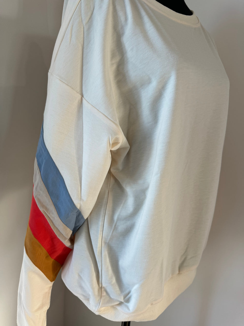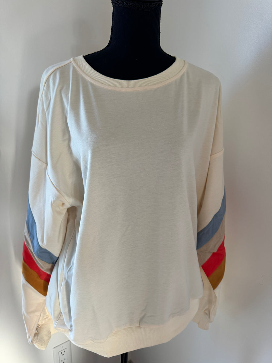 70’s is the era we are in. This basic tee with a fun rainbow detail.