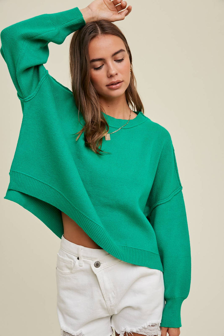 RELAXED CROP SWEATER WITH SIDE SLITS 50% VISCOSE, 28% POLYESTER, 22% NYLON *PRE-ORDER 11/30 - BRICK, RED 01/31 - CREAM/NAVY * Due to lighting and differences in monitors, actual colors may vary slightly from what appears online.