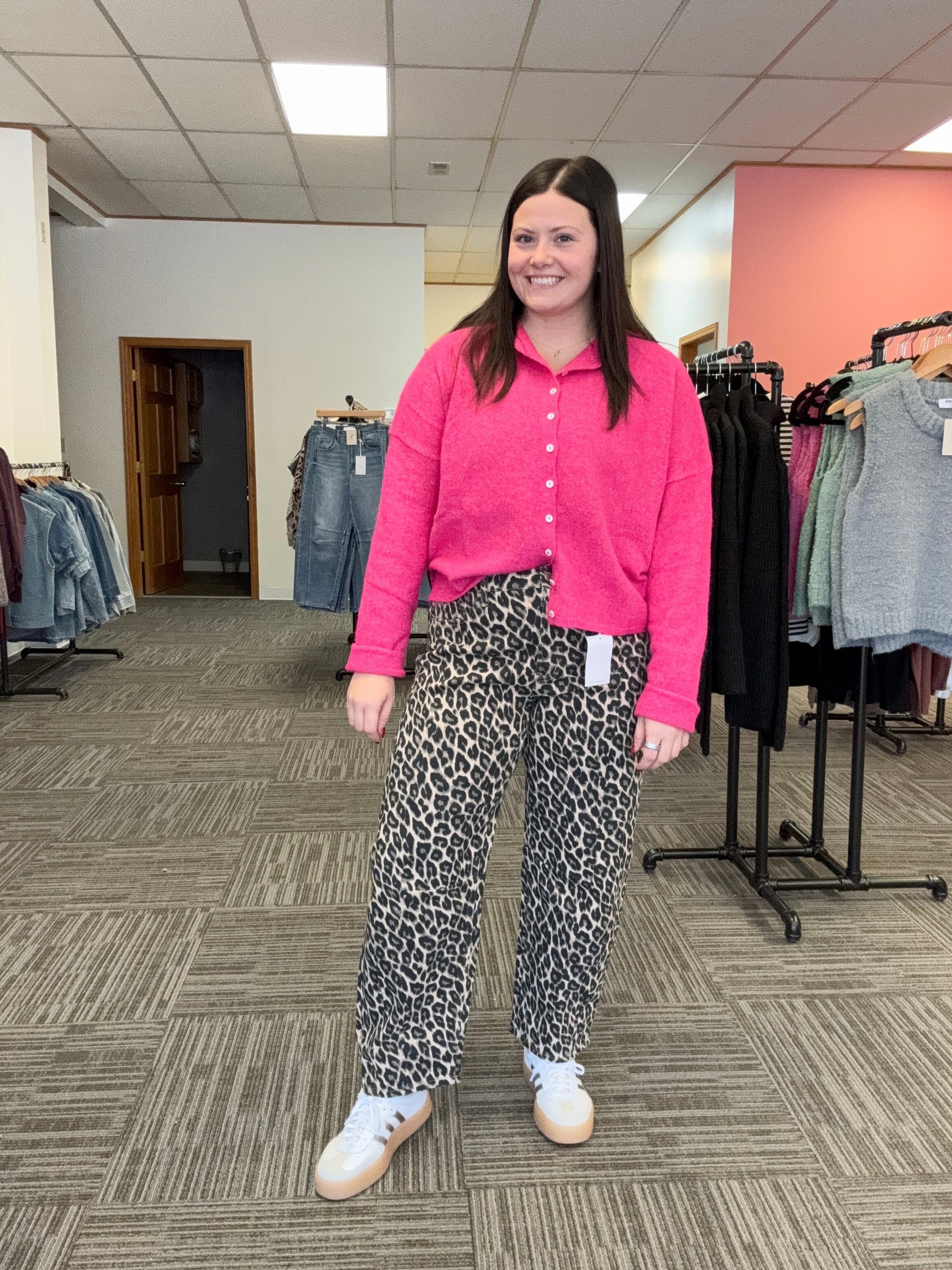 HIGH RISE LEOPARD PRINT BARREL JEANS