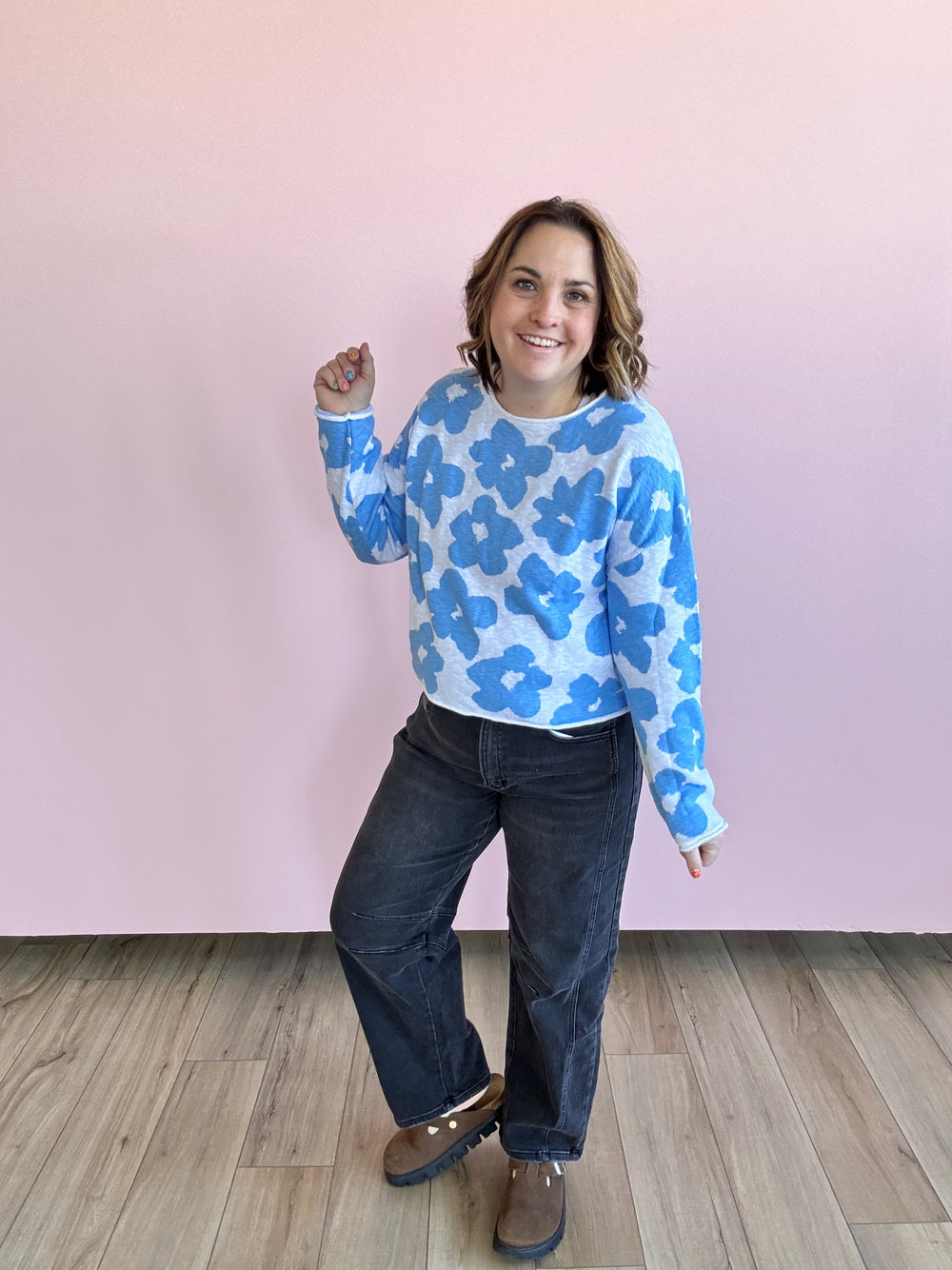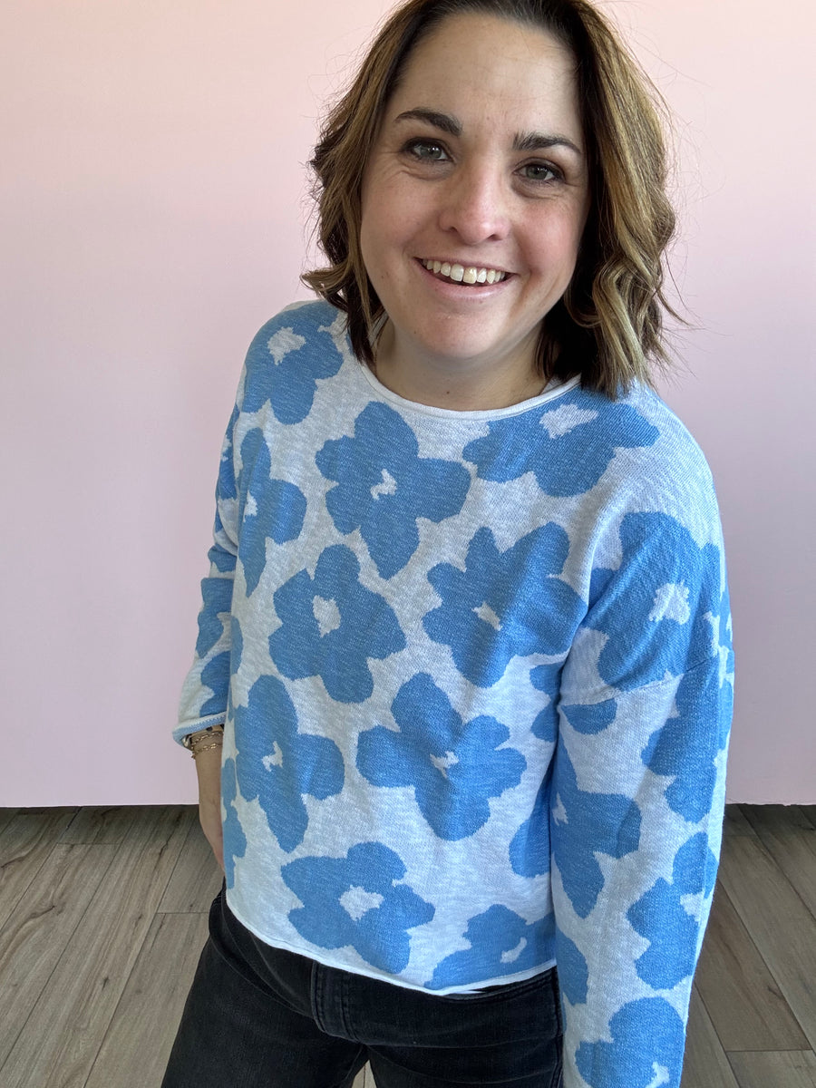 Jump into retro chic with the Belle Blue Flower sweater. This sweater features a 70's vibe with a bold floral design, perfect for adding a fun pop of color to any outfit. Stay cozy and stylish with this quirky and playful piece!