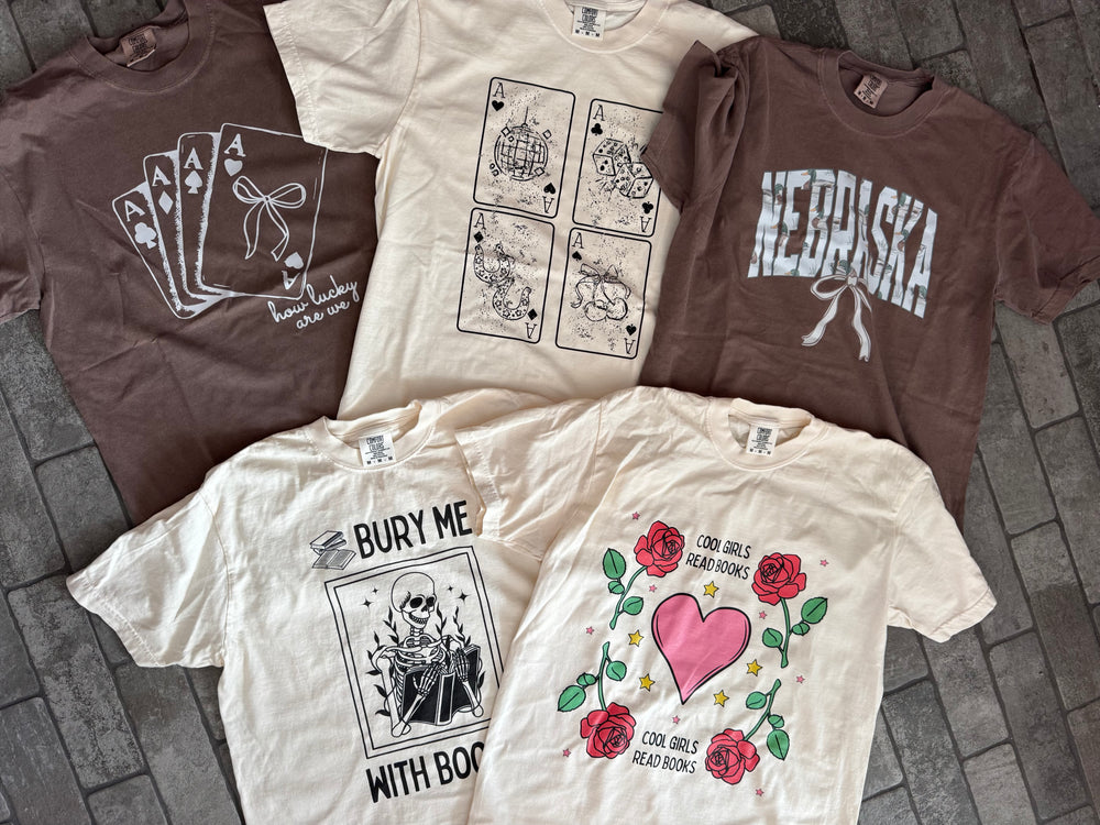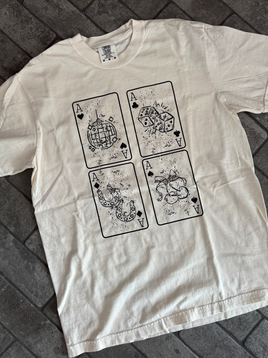 This graphic t-shirt is the perfect combination of luck and style. Featuring aces, dice, horseshoes, cherries, and bows, this tee is sure to be a hit! Roll the dice and add a touch of quirkiness to your wardrobe with this Aces tee. (Bet you'll like it!)
