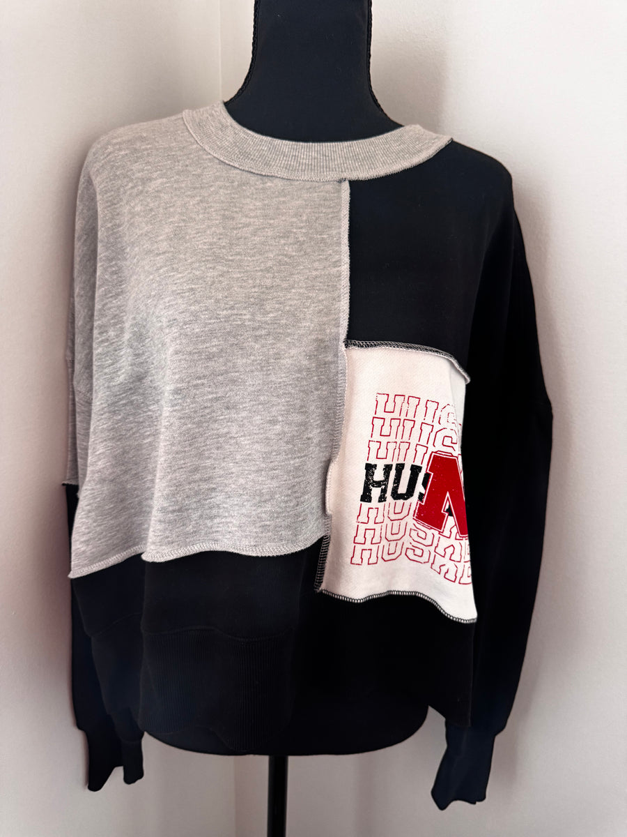 Upgrade your game day look with our Nebraska quilted crew. Featuring a unique patchwork design and team logo, this cozy crew is perfect for fall sports season. Show off your love for the Huskers in style!