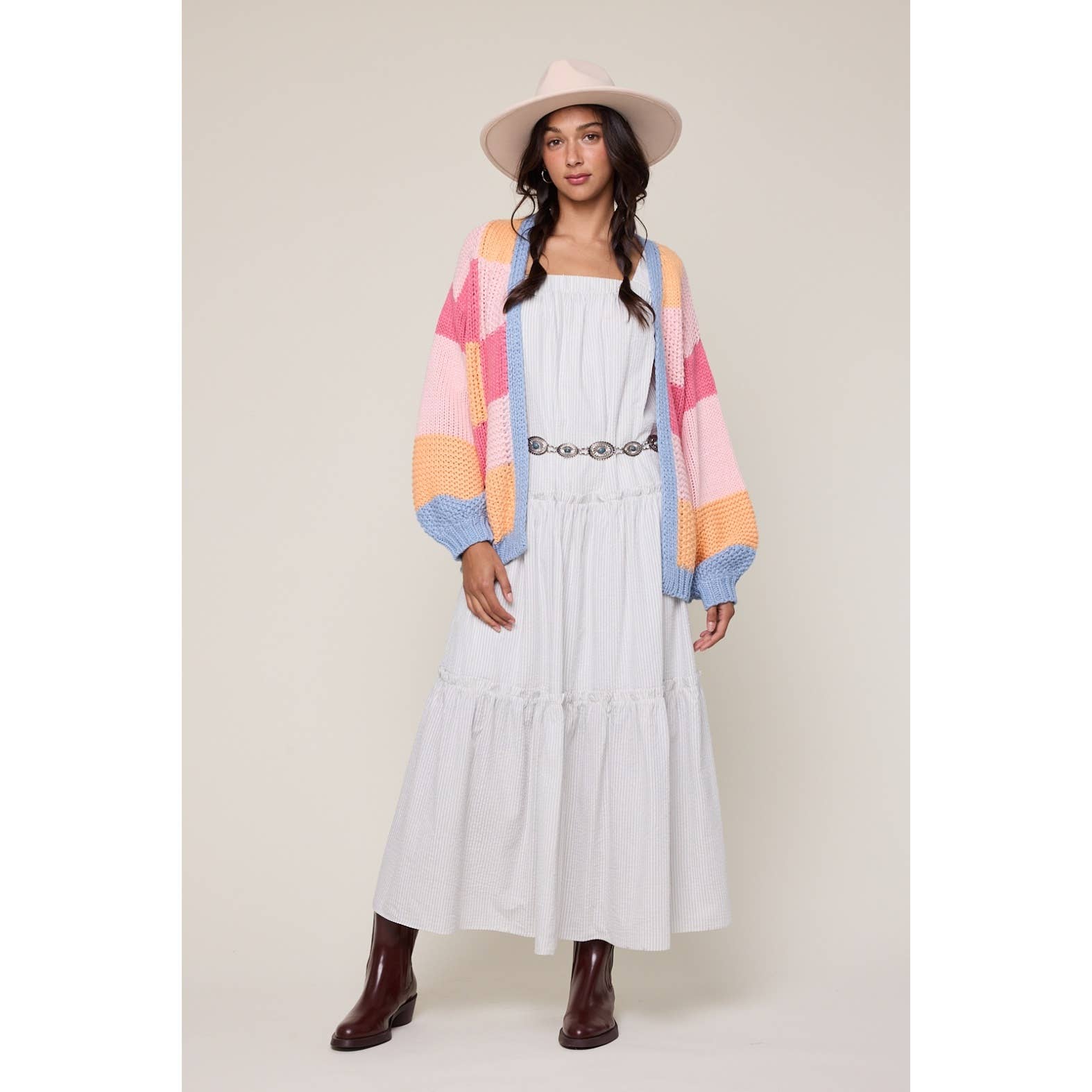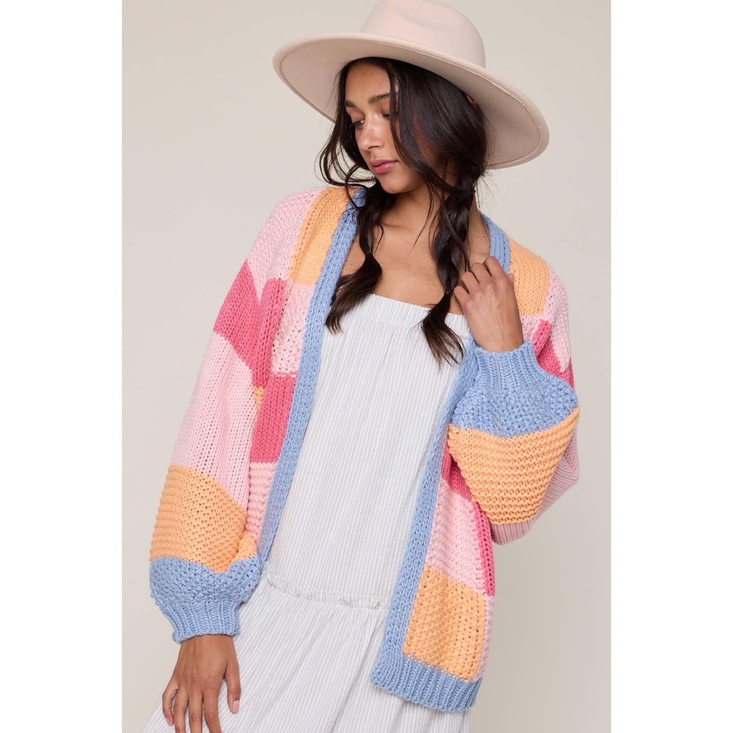 Cozy open-front cardigan featuring bold colorblock panels and a textured, quilted knit. Finished with balloon sleeves and contrast trim for a playful, statement-making layer. - LONG SLEEVE, OPEN FRONT, EASY, COMFY, RELAXED FIT, CASUAL, EVERYDAY, GOOD FOR LAYERING, SUMMER, SPRING
