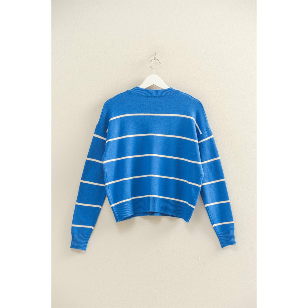Embrace effortless style with this timeless striped sweater, featuring a classic crew neck and long sleeves. Its structured silhouette ensures a flattering fit, making it a versatile choice for a variety of occasions. Ideal for layering, style it over a collared shirt or under a sleek jacket for those chilly evenings. 50% rayon 28% polyester 22% nylon