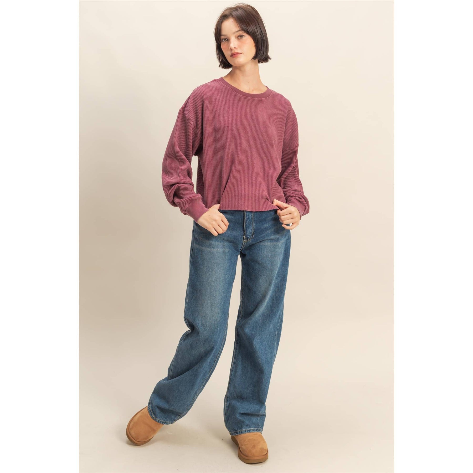 Stay Cozy And Stylish With This Waffle Long Sleeve Top. Featuring A Relaxed Fit And Crew Neckline, This Top Is Perfect For Layering Or Wearing On Its Own. The Waffle Fabric Offers Both Comfort And A Trendy Texture, Making It An Ideal Choice For Casual Outings Or Lounging At Home. Pair It With High-Waisted Jeans Or Sweatpants For A Laid-Back Look. 100% Cotton